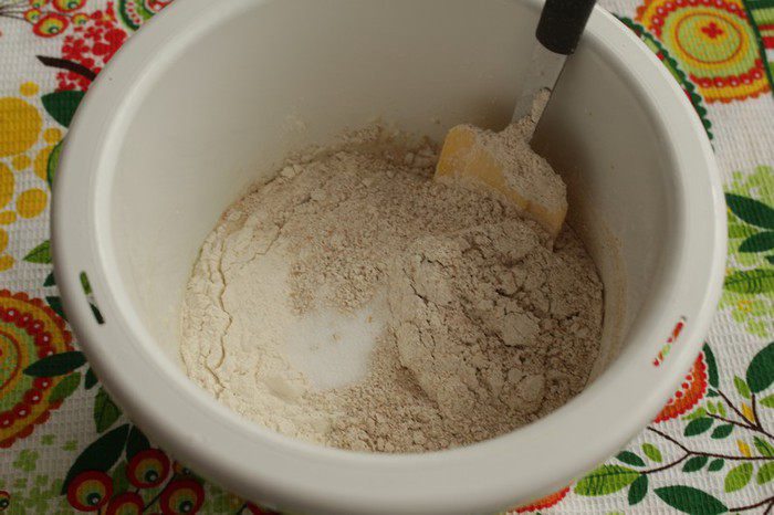 Затем всыпать оба вида муки, соль.