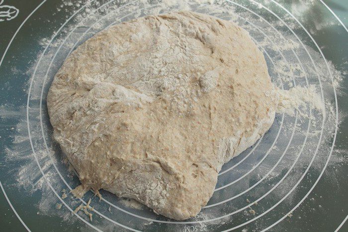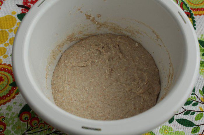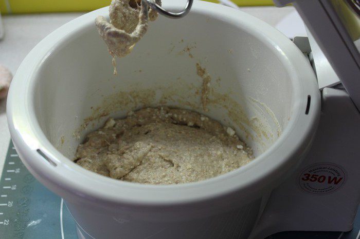 Тесто очень липкое, поэтому лучше его замесить в комбайне, либо в хлебопечи. Цикл работы составит 10-12 минут для первого замеса, 20 минут для отдыха, 8-10 минут для второго замеса.