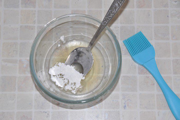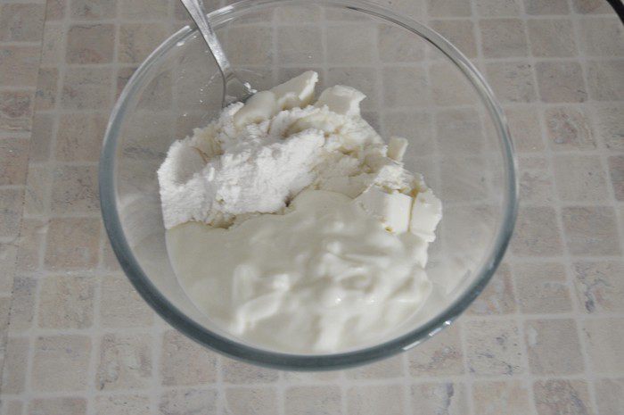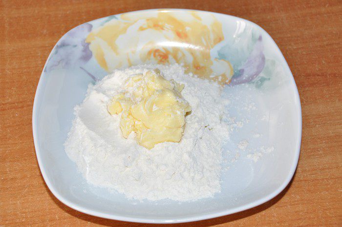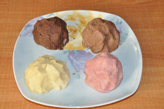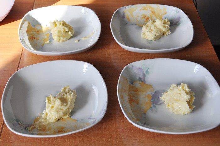 Смешать мягкое сливочное масло, сахарную пудру и щепотку соли до пастообразной массы (я перемешала вилкой). Выбирайте лучшее сливочное масло, которое можете себе позволить – без отдушек и ароматизаторов. Все-таки вкус масла для этого теста очень значим. Разделить полученную массу на 4 равных части (должно получится по 80 грамм) и разложить на 4 тарелки.