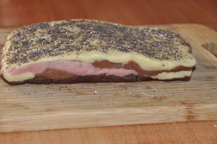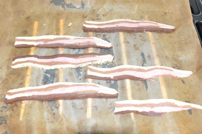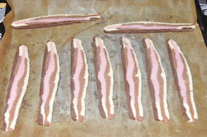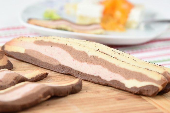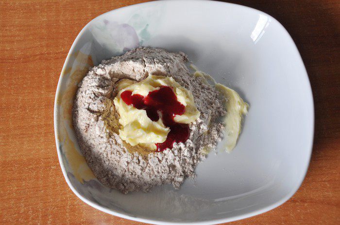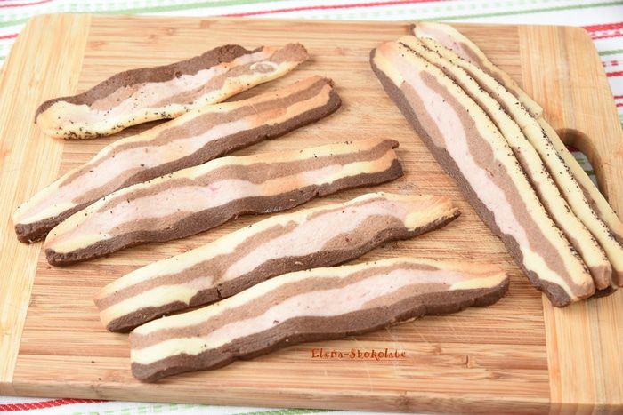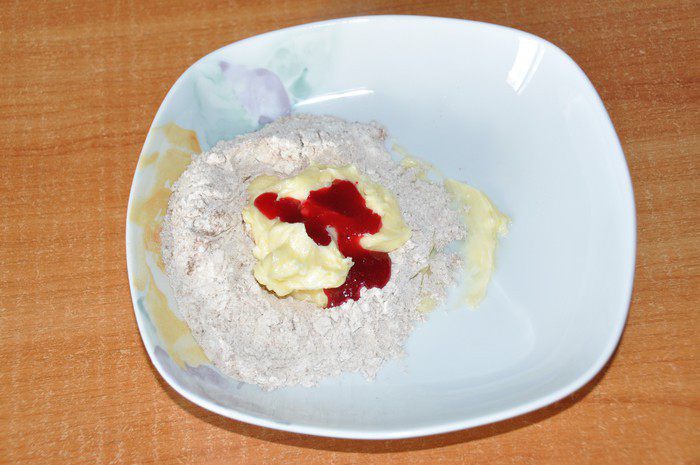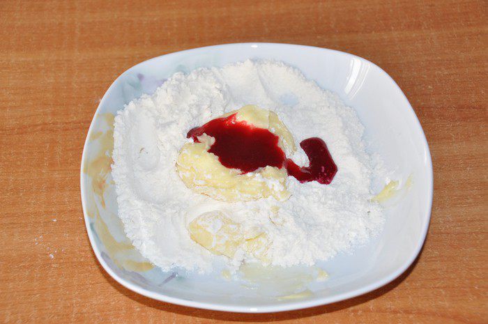 Это песочное печенье мы окрасим таким образом, что будет похоже на полоски бекона, которые подают к завтраку. Поскольку я использовала натуральные красители, а их требуется больше, чем жидких искусственных (больше, чем несколько капель) – окрашивать тесто мы будем на стадии замеса. Горсть клюквы разморозить, раздавить ягоды, процедить - нам понадобится 3 столовых ложки клюквенного сока.
