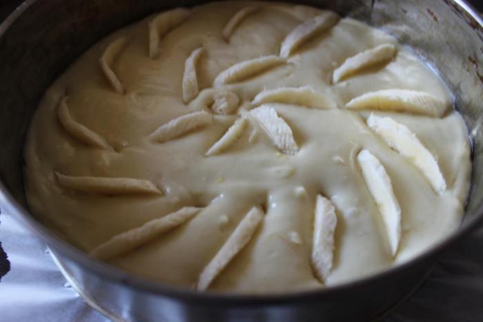 Форму (я брала разъемную 21 см) смазать маслом (дно я еще застелила пергаментом), выложить тесто, разровнять его и аккуратно вдавить порезанные некрупными дольками фрукты (у меня бананы).