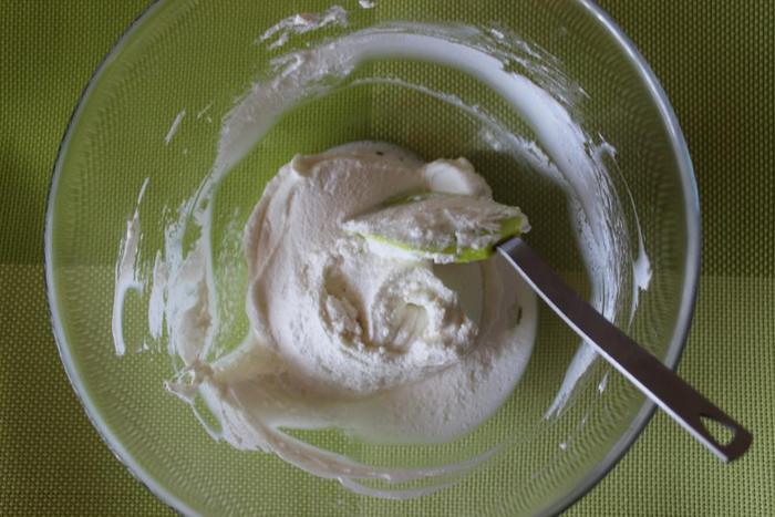 Яйца с сахаром взбить добела, добавить к ним оливковое масло, соль, натертую мелко цедру лимона, муку и рикотту. Тщательно вымешать. Тесто не должно быть жидким, но и не совсем плотным.