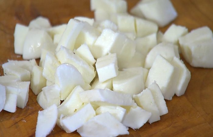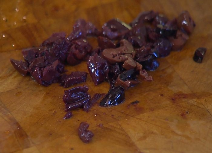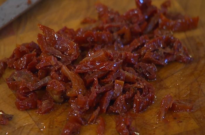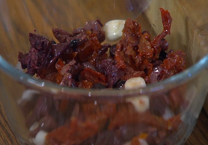 Приготовить заправку: вяленые помидоры перемешать с нарезанными оливками и чесноком.