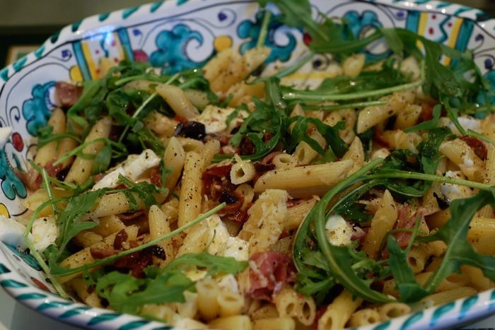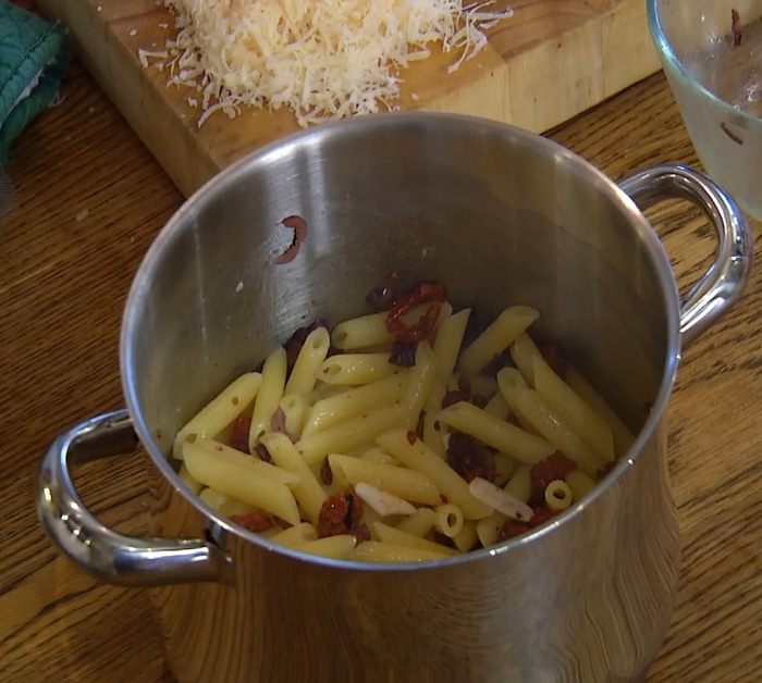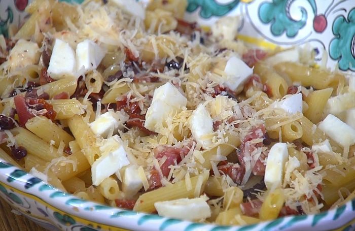 Пармезан не единственный сыр, который здорово работает в пасте, итальянцы любят добавлять в макароны и пекорино, и рикотту. Но если вы в еде консерватор, спокойно заменяйте рикотту некислым творогом, а из твердых сыров берите пошехонский, российский или даже копченый сулугуни, главное здесь — сливочность. Сыровяленую ветчину можно заменить сырокопченой. Заправка из вяленых помидоров с оливками подойдет как к теплым макаронам, так и к холодным.