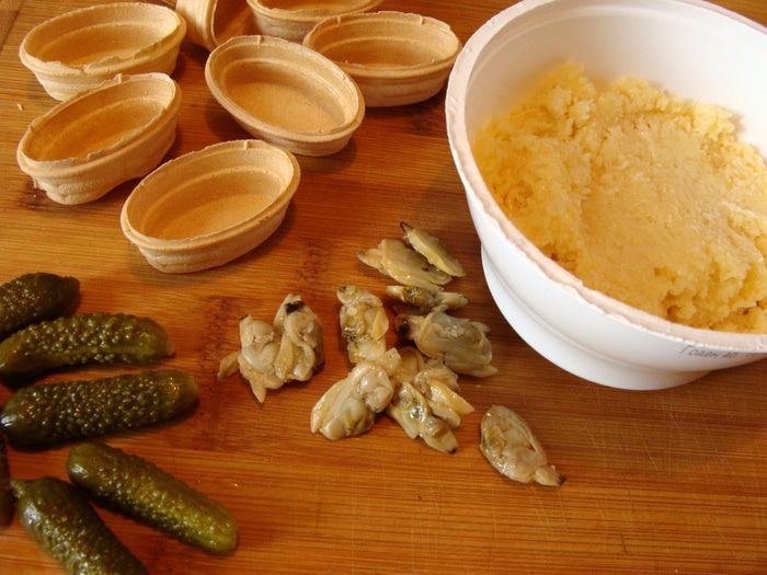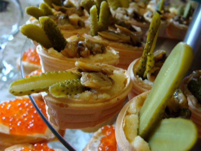 На маленькую тарталетку один огурчик и две ракушки. Главное подать сразу! Вафельные тарталетки довольно быстро впитывают влагу и становятся мягкими.