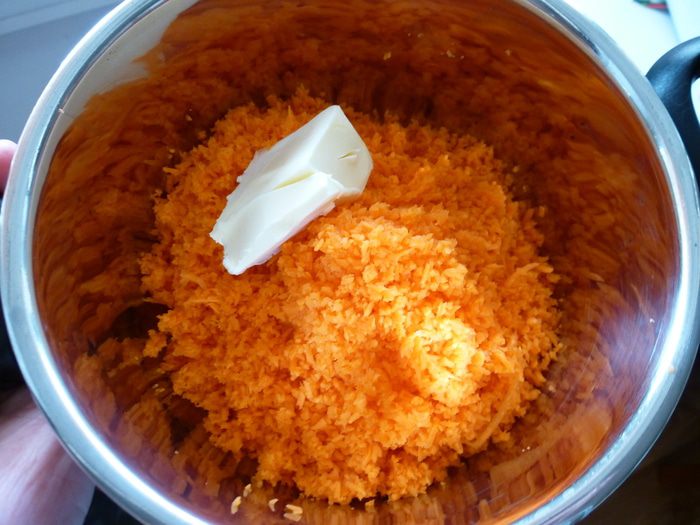 Морковь натираем на самой мелкой терке. Перекладываем морковь в кастрюлю (или в сковородку), добавляем сливочное масло и воду, тушим под закрытой крышкой 15 минут до мягкости.