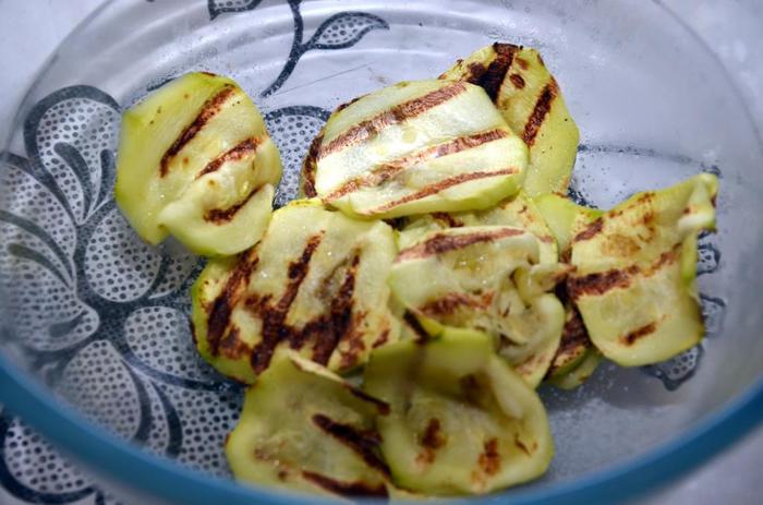 Кабачки помыть, почистить, посолить, обжарить на сковороде или на гриле.