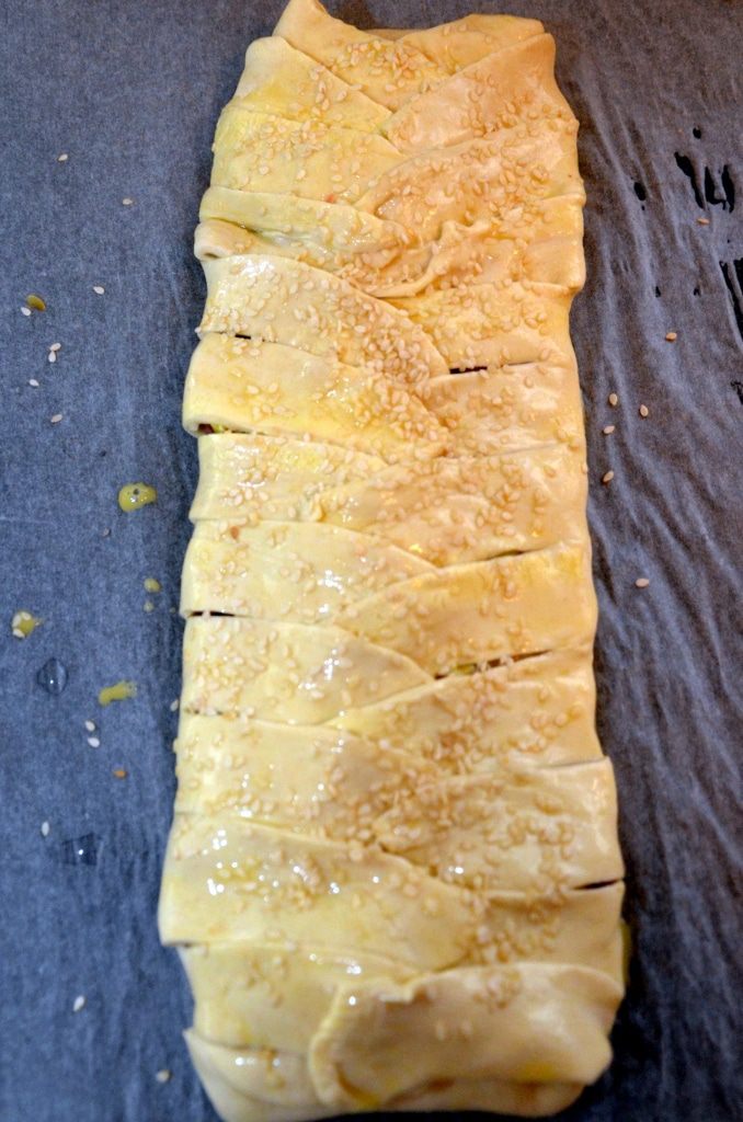 По краям теста сделать надрезы на расстоянии примерно 1 см и "сложить" сверху косичкой. Помазать сверху взбитым яйцо и посыпать кунжутом.