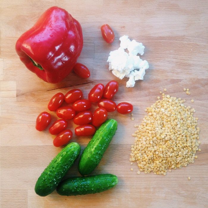 Белковый салат с чечевицей, овощами и творожным сыром