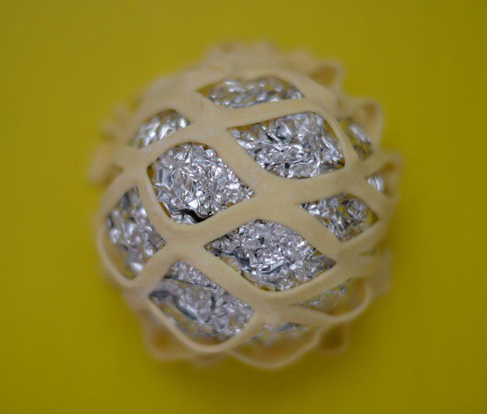 Сеточку немного растянуть, окутать ею яблоко так, чтобы паутинка образовала достаточный проем внизу, чтобы потом вынуть яблоко. Яблоко испечется, станет мягким и меньше в размере, оно без проблем вытаскивается из паутинки.