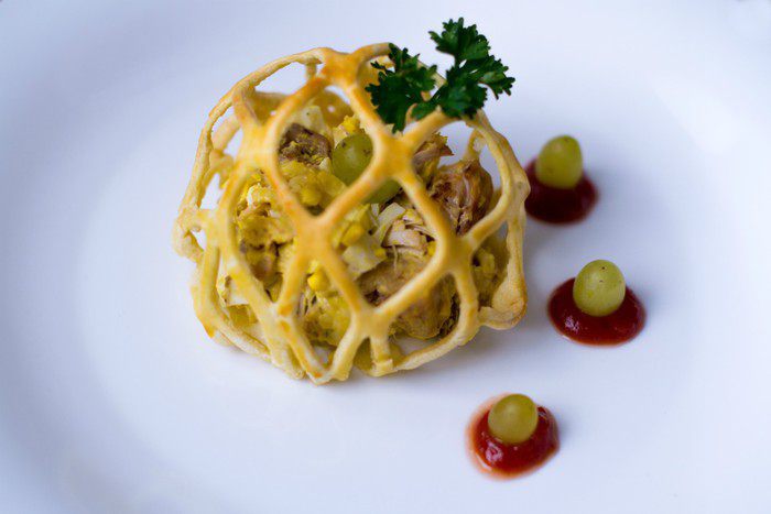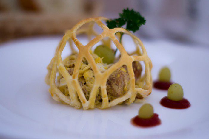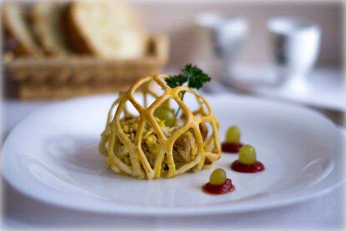 Блюдо для конкурса "Ювелирный подход во всем". Акцент сделан не на салат, а на его подачу. Салат может быть любым, но подать, украсить его тоже можно ювелирно. Тонко раскатать тесто, растянуть на заготовке так, чтобы сеточка легла ровно и четко, а потом также аккуратно вынуть заготовку, здесь тоже требуется ювелирность. Одна оплошность и все придется начинать по новой. На самом деле все не так сложно, просто нужна небольшая сноровка. Зато, подав салат таким образом на праздничный стол, гостей удивите однозначно. Этот салат они еще долго будут вспоминать).