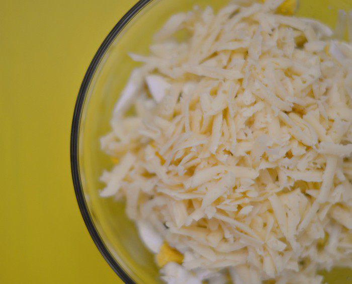 Добавить натертый на крупной терке твердый сыр, можно пармезан.