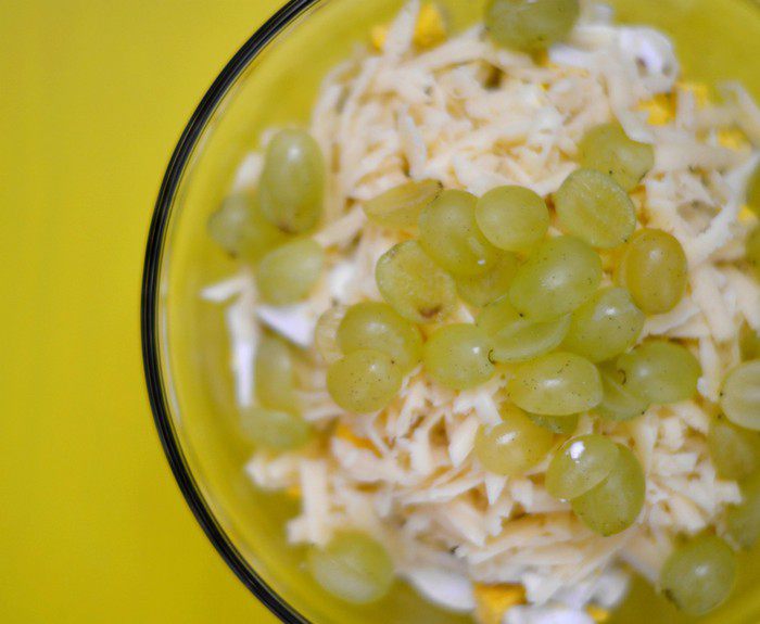 Добавить порезанный пополам виноград без косточек.