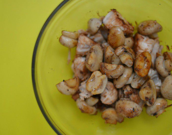 Шампиньоны почистить, посолить, обжарить . Добавить к куриному филе.