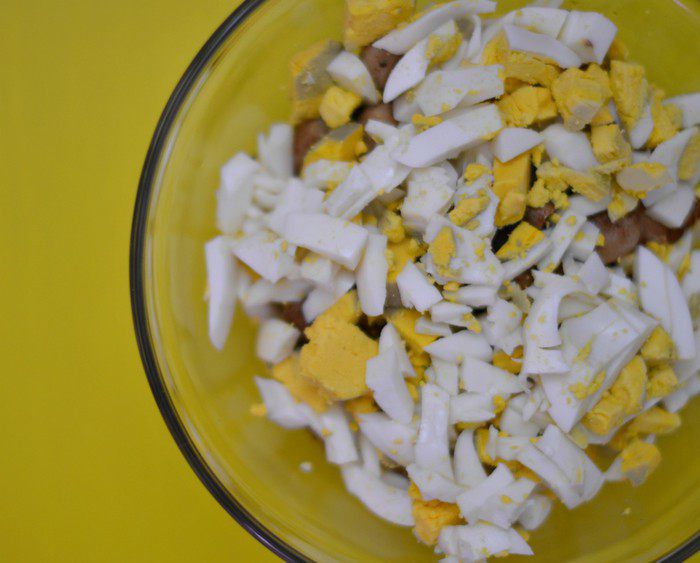 Отварить яйца. Крупно порезать. Добавить к грибам и мясу.