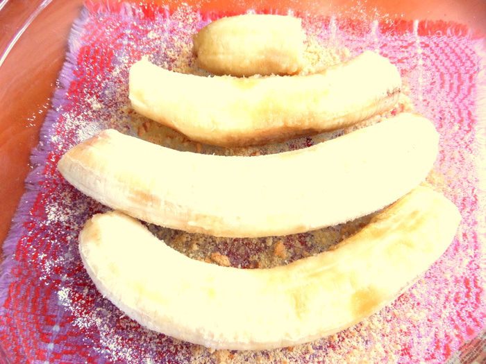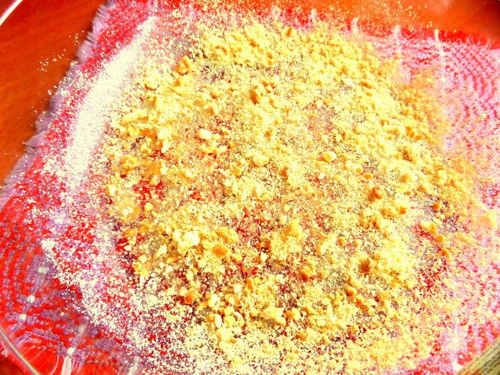 Дно формы для СВЧ смазать растительным маслом без запаха и посыпать крошкой.