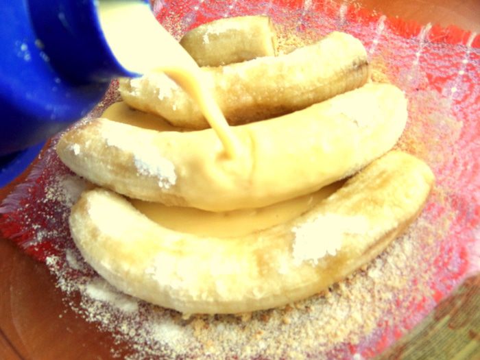 Уложить на дно бананы, сбрызнуть лимонным соком и посыпать пудрой.