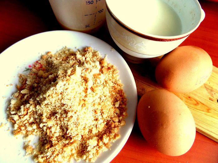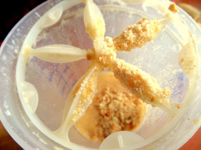 Взбить в шейкере яйца с молоком и немного опять печенья.