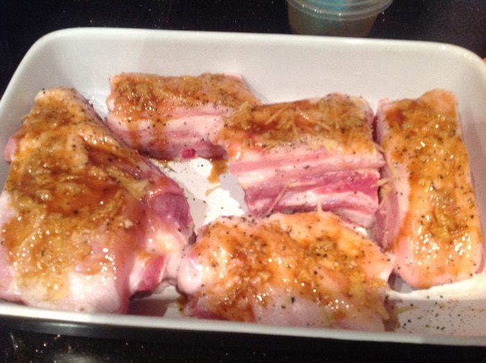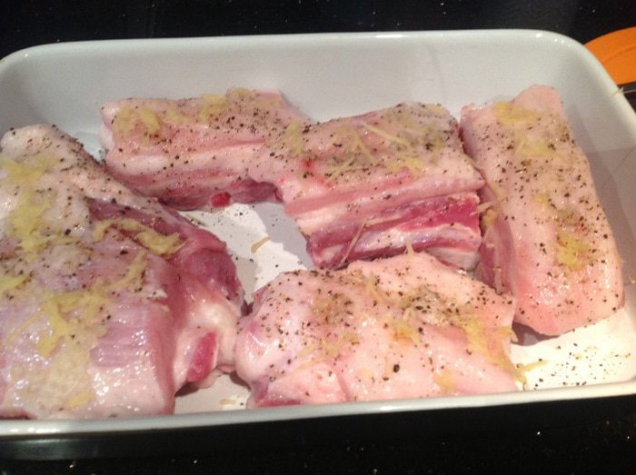 Имбирь (кусочек 1-2 см) и чеснок почистите и натрите на мелкой терке. Ребрышки помойте, обсушите бумажным полотенцем, разрежьте на порции, натрите солью, перцем, имбирем и чесноком.
