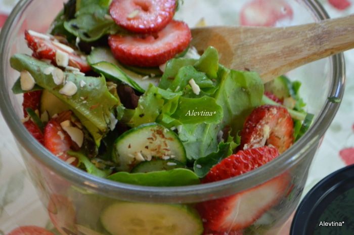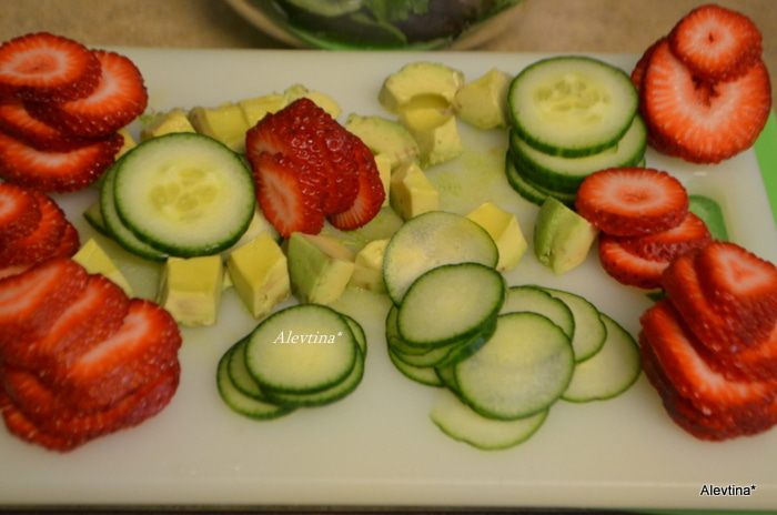 Для салата можно использовать смесь молодых салатных листьев или только листья шпината. Клубнику очистить и порезать, огурец тонко нарезать, авокадо очистить от кожуры и ядра, порезать кубиками, миндальные лепестки подсушить. Фету или козий сыр желательно нарезать крупными кусочками.