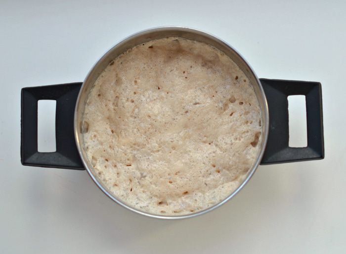 Приготовление опары. 80 мл теплой воды, 20 гр живых дрожжей, 80 гр муки смешать. Накрыть. Дать подойти в течении 30 мин.