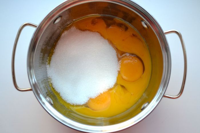 Отделить желтки от белков. Желтки соединить с сахаром.