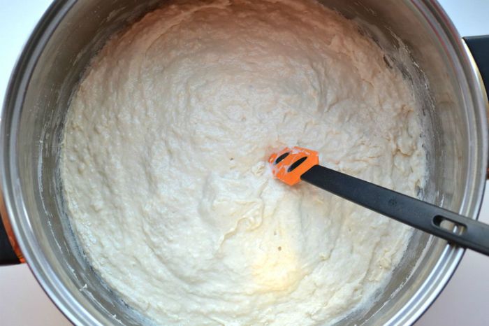 К опаре добавить соль, молоко с дрожжами, взбитые желтки с сахаром. Все перемешать. Добавить муку с маслом и взбитые белки. Перемешать.