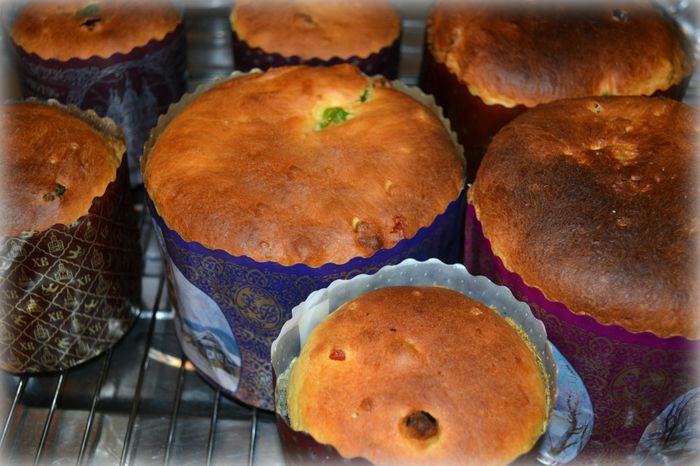 Выпекать в заранее нагретой до 200С духовке 10 мин, затем температуру снизить до 170С и выпекать еще 30 мин. Если сверху куличи начнут подгорать , прикройте их пекарской бумагой или фольгой. Маленькие куличи вынуть раньше. Готовность проверять лучинкой.