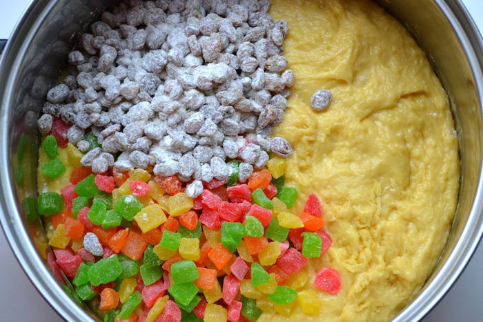 Всыпать изюм, цукаты и цедру. Перемешать. Поставить на расстойку в теплое место. После первого подъема обмять, после второго подъема снова обмять. Расстойка занимает примерно 2 часа.
