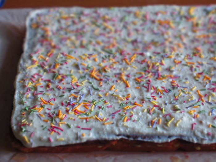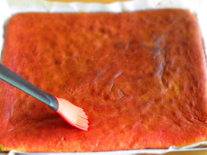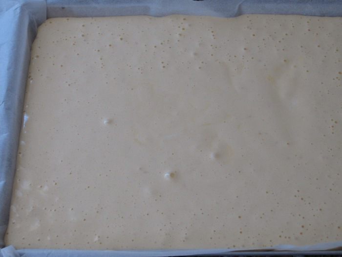 Выложить тесто в прямоугольную форму с пергаментом и выпекать в разогретой до 180 С духовке 25-30 минут. Готовый бисквит остудить на решётке.
