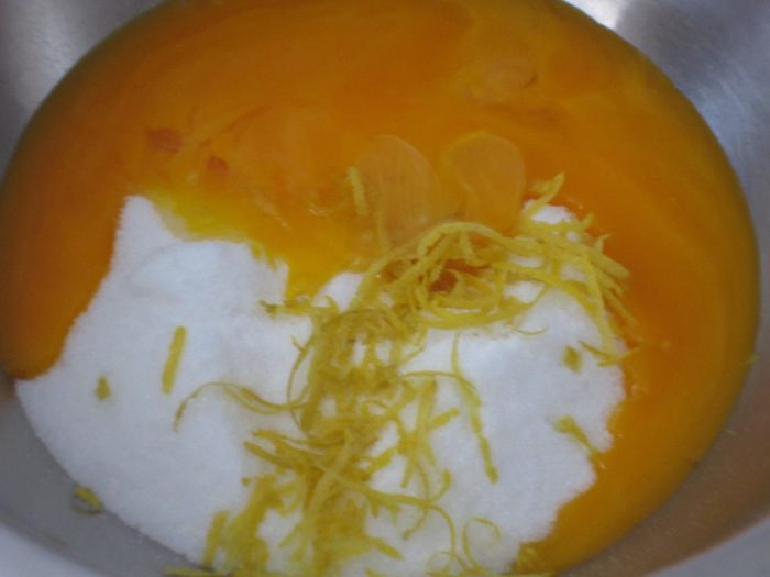 Взбить желтки с сахаром, лимонной цедрой и ванилином до побеления и увеличения массы вдвое.
