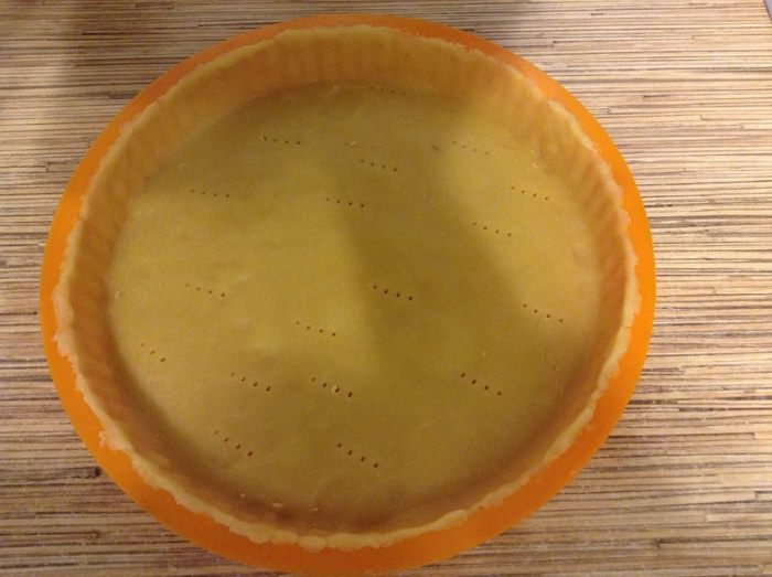 Я готовлю песочное тесто в блендере, муку и холодное масло пробить в крошку или перетереть руками. Добавить соль, желток, воду. Быстро собрать в шар и завернуть в пищевую пленку. Воду добавляйте ледяную и по ложке, возможно, одной будет достаточно. Отправляет в холодильник на 1 час.