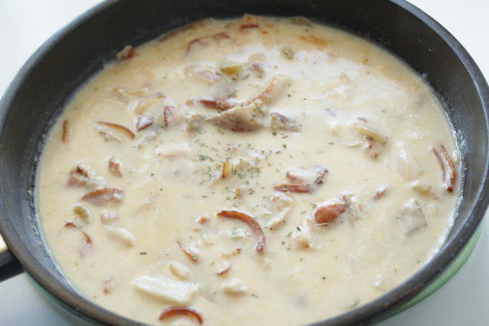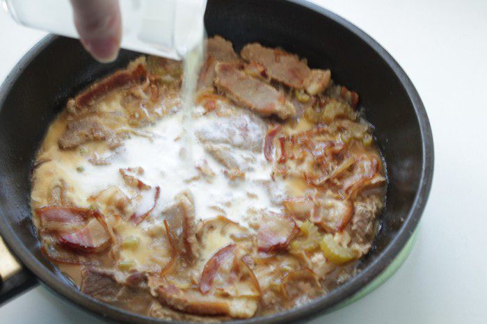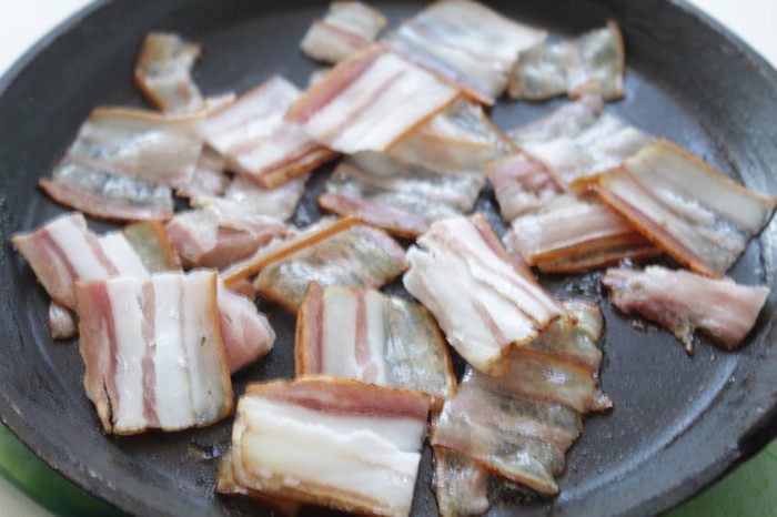 В другой сковороде обжарьте нарезанный бекон или грудинку до хрустящей корочки.