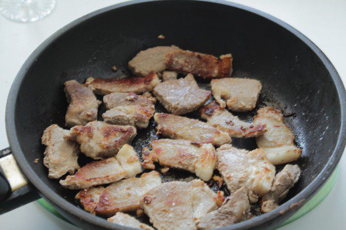 Духовку разогреть до 170С. В сковороде (жаровне), которую можно поставить в духовку, обжарьте нарезанное на кусочки мясо до золотистой корочки.