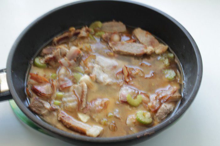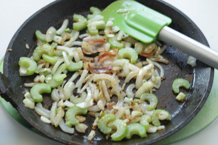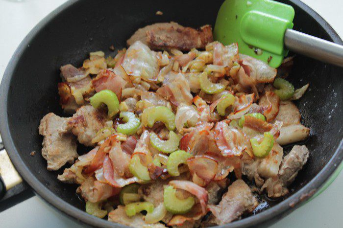 Уберите бекон со сковороды и в выделившемся жире обжарьте лук, чеснок, сельдерей до мягкости