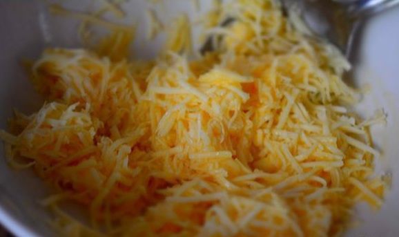 Желтки смешать с тертым сыром (оставить немного сыра для шапочки).