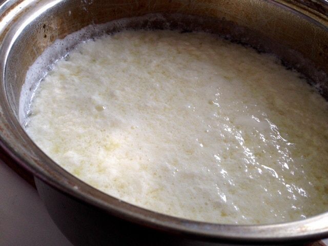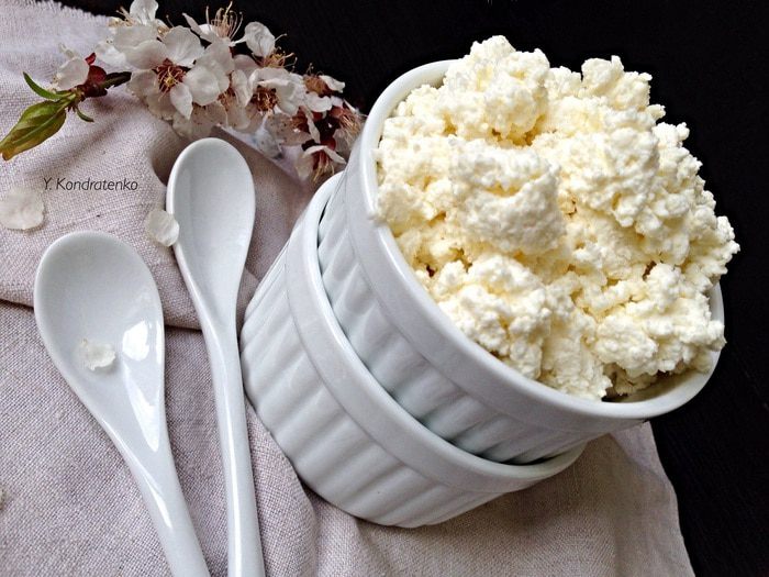 В дуршлаг выложить марлю. Затем шумовкой выложить свернувшуюся творожную массу и чуть отжать!