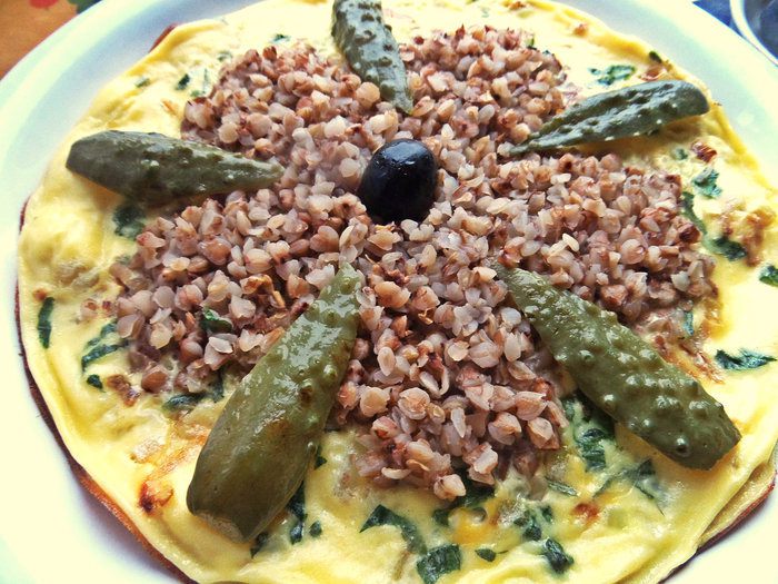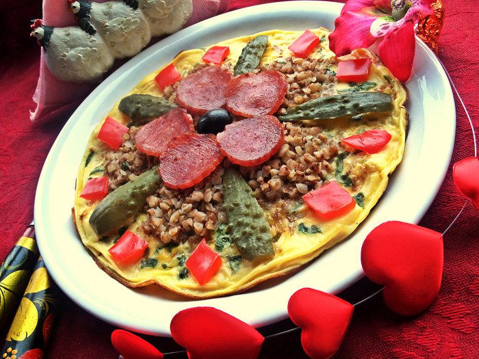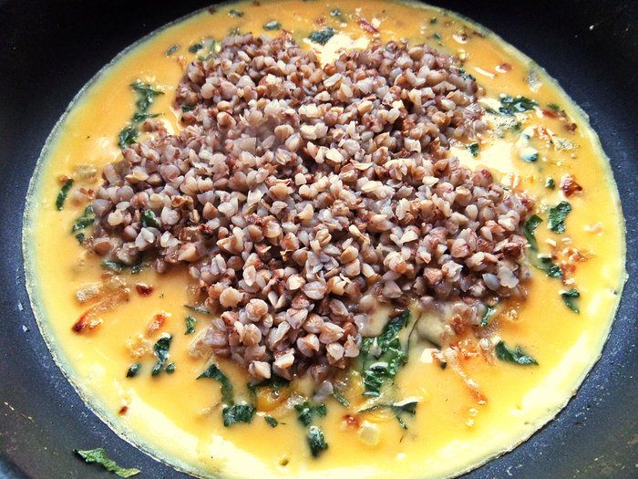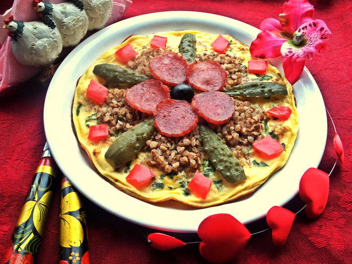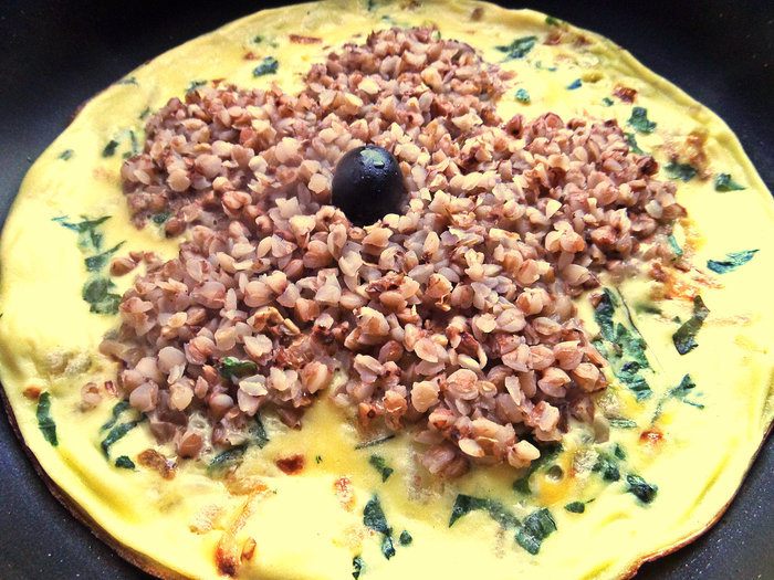 Когда по краям омлет схватится, отставим его с огня, чтобы сделать цветок из гречки.