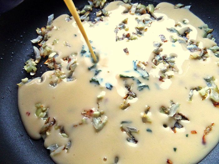 Взбиваем яйца с молоком или сметаной с водой или просто водой, не суть важно! Бросим пару щепоток соли и немного зелени.