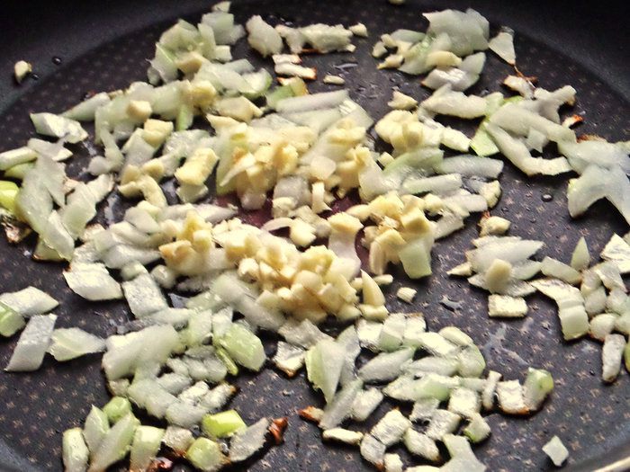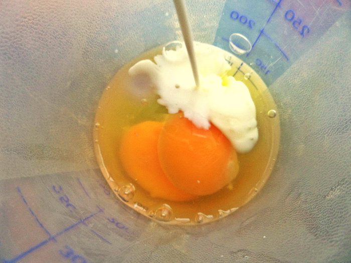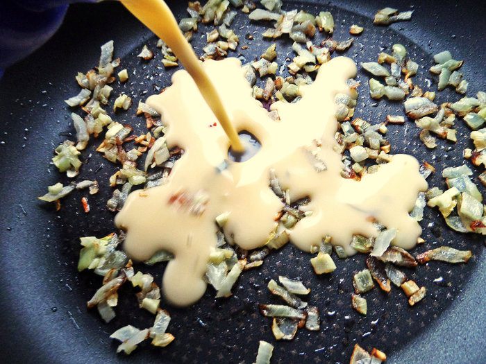 Взбиваем в шейкере (он у нас каждый день трудится - то смузи, то омлет!) и выливаем на лук.