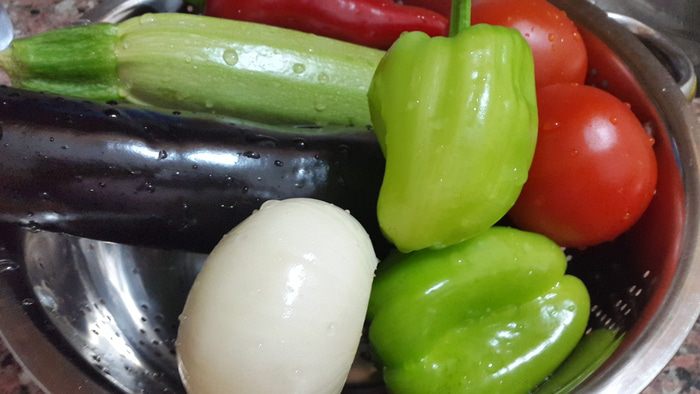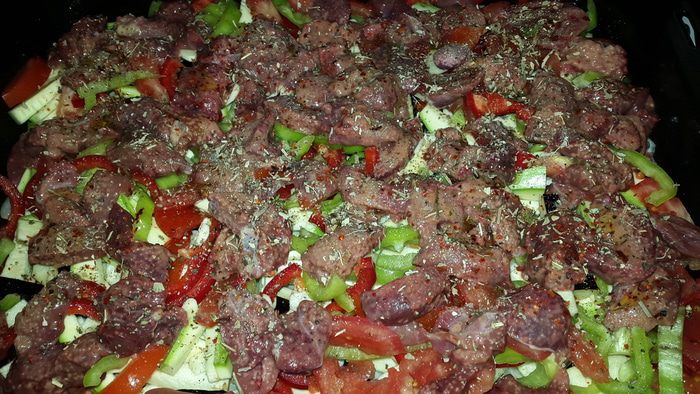 Печень промываем под проточной водой, убираем жир и ненужные жилки и режем небольшими кусочками. Выкладываем печень на овощи, солим, перчим двумя перцами, посыпаем сушеным базиликом, сбрызгиваем оливковым маслом, отправляем в духовку на нижний уровень и включаем её на 200 С.