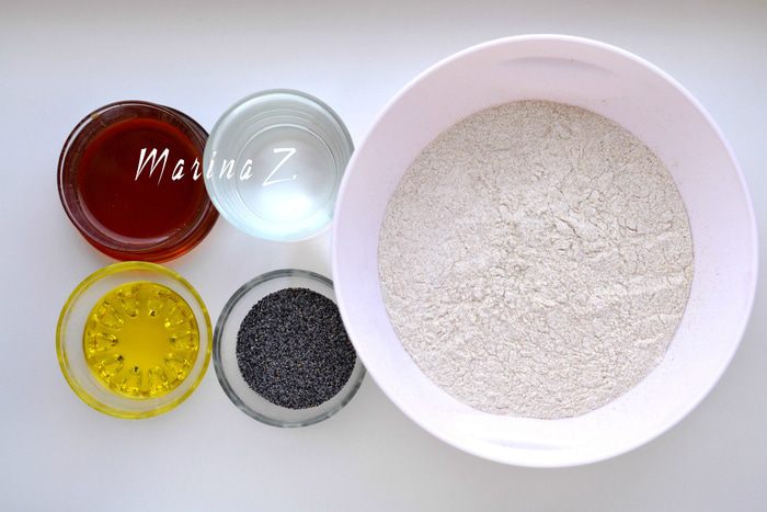Муку смешать с солью, просеять. Добавить мак, перемешать. Добавить масло и мед, затем воду.