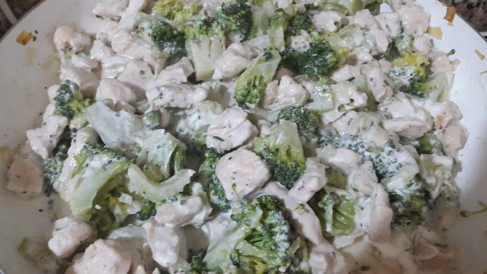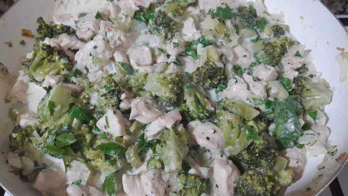 Когда жидкости из курицы выпарилась, добавляем брокколи и сыр, аккуратно перемешиваем, немного солим, накрываем крышкой и тушим на медленном огне примерно 10 минут.