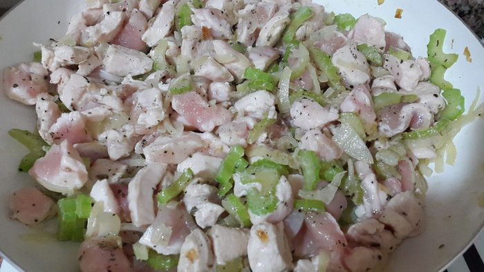 Отправляем курицу к луку с сельдереем, тушим, периодически помешивая. Солим, перчим, добавляем сушеный базилик и тушим на небольшом огне до выпаривания жидкости.
