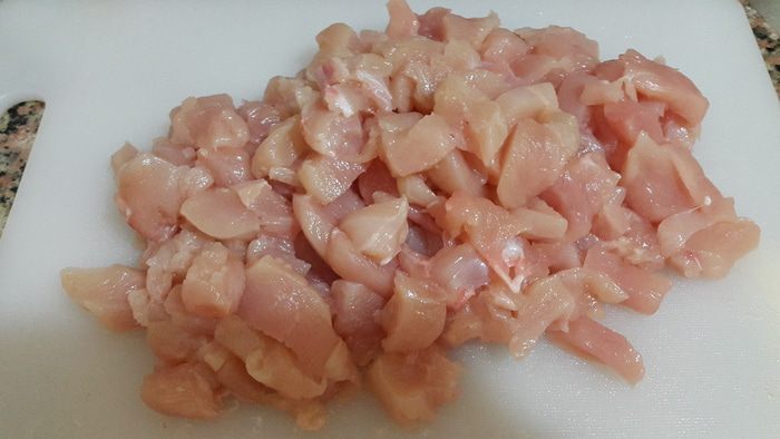 Куриные грудки моем, обсушиваем и режем небольшими кусочками.