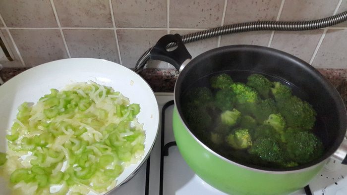 Репчатый лук режем на четверть кольца, сельдерей дольками и обжариваем их вместе на оливковом масле до мягкости. Параллельно моем брокколи, разбираем на соцветия и бланшируем 7 минут.