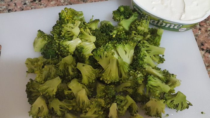 Брокколи откидываем на дуршлаг, обдаем холодной водой и режем крупные соцветия на 4 части, а более мелкие на 2.