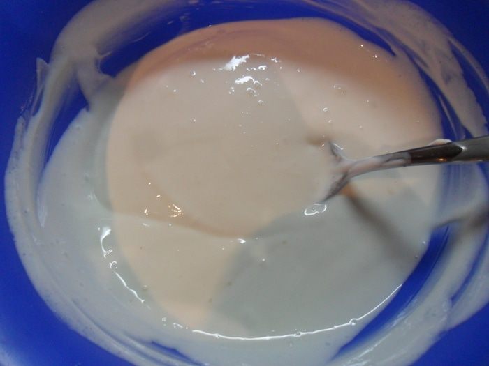 Сметану смешать с сахарной пудрой и оставшейся половиной желатина.