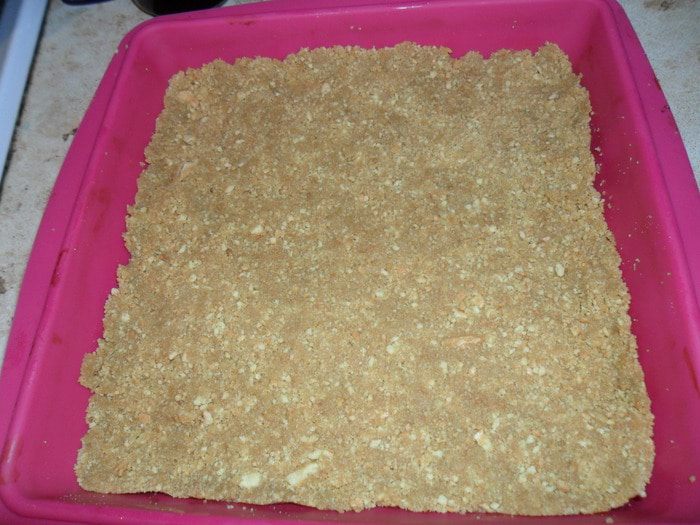 В крошку влить растопленное сливочное масло и выложить в форму, хорошо утрамбовать. Отправить в холодильник.