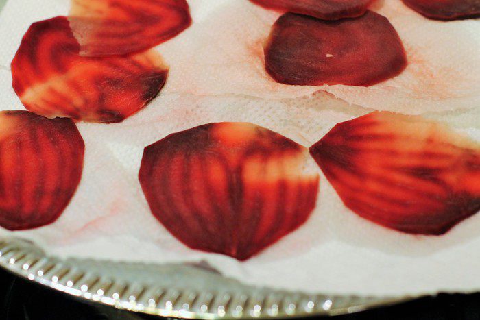 Подготовьте заранее бумажные полотенца. Достаньте ломтики с помощью шумовки и выложите на полотенце, чтобы промокнуть и удалить влагу.